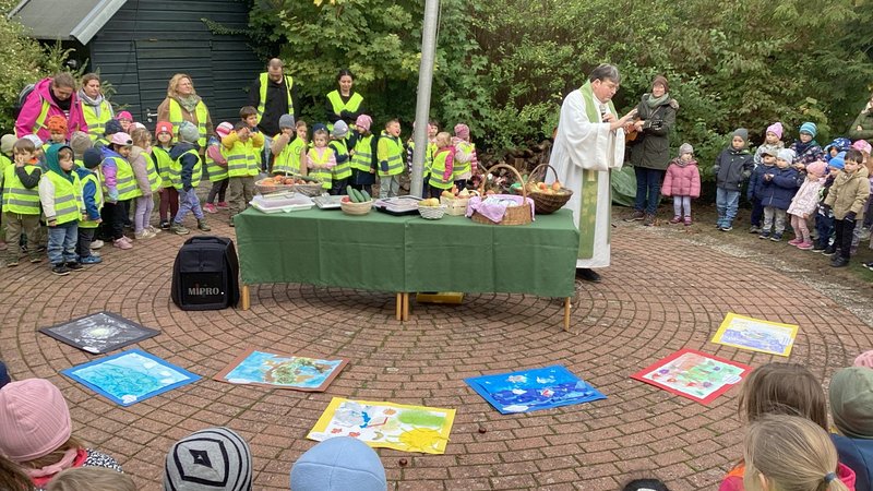 Die Kindergartenkinder trafen sich zur selben Zeit mit den Kindergartenkindern der Kitas St. Gertrud, St. Bonifatius Amtsstraße und Frankestraße zusammen mit Pfarrer Andreas Körner vor der Kirche für eine gemeinsame Andacht. Es wurde gemeinsam gebetet, gesungen, die Schöpfungsgeschichte erzählt und die Ernte gesegnet. Am Ende wurden Körbe voller Erntegaben zwischen den Kitas geteilt und gemeinsam selbsgebackener Kuchen gegessen, bevor es gestärkt zurück in die Kitas ging.